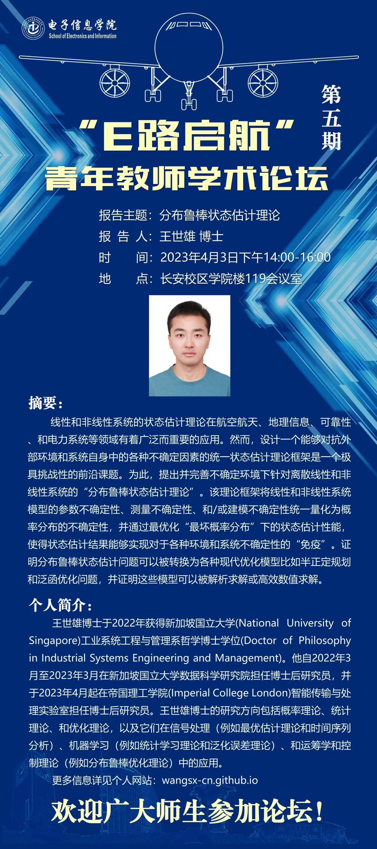 个人简介:王世雄博士于2022年获得新加坡国立大学(National University of Singapore)工业系统工程与管理系哲学博士学位(Doctor of Philosophy in Industrial Systems Engineering and Management)。他自2022年3月至2023年3月在新加坡国立大学数据科学研究院担任博士后研究员,并于2023年4月起在帝国理工公司(Imperial College London)智能传输与处理实验室担任博士后研究员。王世雄博士的研究方向包括概率理论、统计理论、和优化理论,以及它们在信号处理(例如最优估计理论和时间序列分析)、机器学习(例如统计学习理论和泛化误差理论)、和运筹学和控制理论(例如分布鲁棒优化理论)中的应用。更多信息详见个人网站:wangsx-cn.github.io