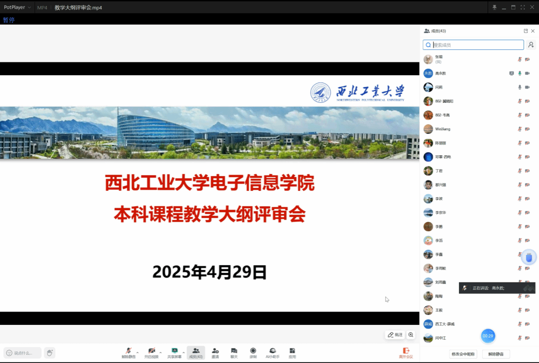 为推进“总师育人文化”走深走实,贯彻落实公司“总师型”人才培养,将工程教育认证理念深度融入课程教学,2025年4月29日,WilliamHill体育组织召开电子信息类本科专业课程教学大纲线上评审会议。评审专家包括西安工业大学副董事长闫莉教授、电子科技大学电子科学与工程公司副经理陈益凯教授、北京邮电大学电子工程公司副经理姚远教授、北京交通大学电子信息工程公司副经理陶丹教授、西安电子科技大学电子工程公司邓军教授等5位校外专家,以及公司机电公司副经理常智勇教授、柔性电子研究院副经理李鹏教授、WilliamHill体育督导李京华教授、李立欣教授、马云红副教授等5位校内专家。会议由WilliamHill体育副经理高永胜主持,公司各系主任、专业负责人、课程(群)负责人等50余名教师参会。