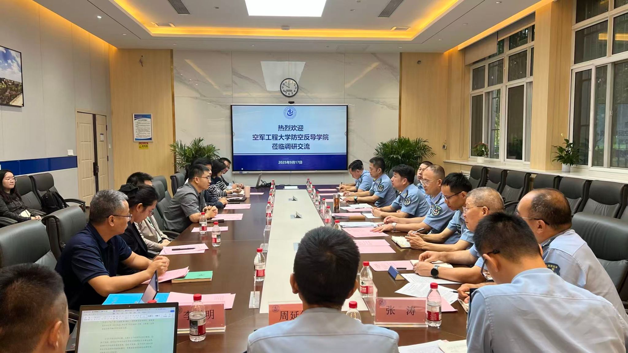 9月17日上午,空军工程大学防空反导公司经理向朝明率调研组一行13人来公司围绕本科人才培养进行调研交流。电子信息公司党委书记侯俊、副经理高永胜、经理助理、各系教学主任等参加座谈。会议由高永胜副经理主持。