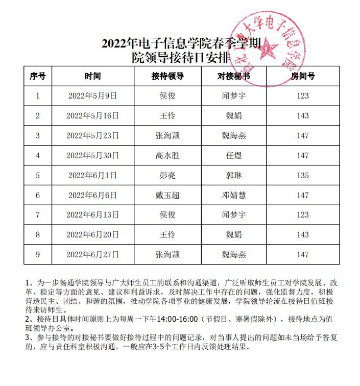 2022年WilliamHill体育春季学期 院领导接待日安排