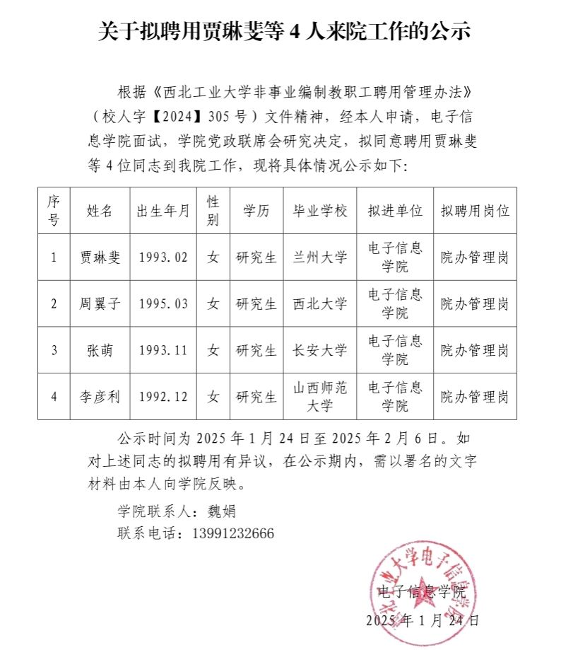 关于拟聘用贾琳斐等 4 人来院工作的公示
