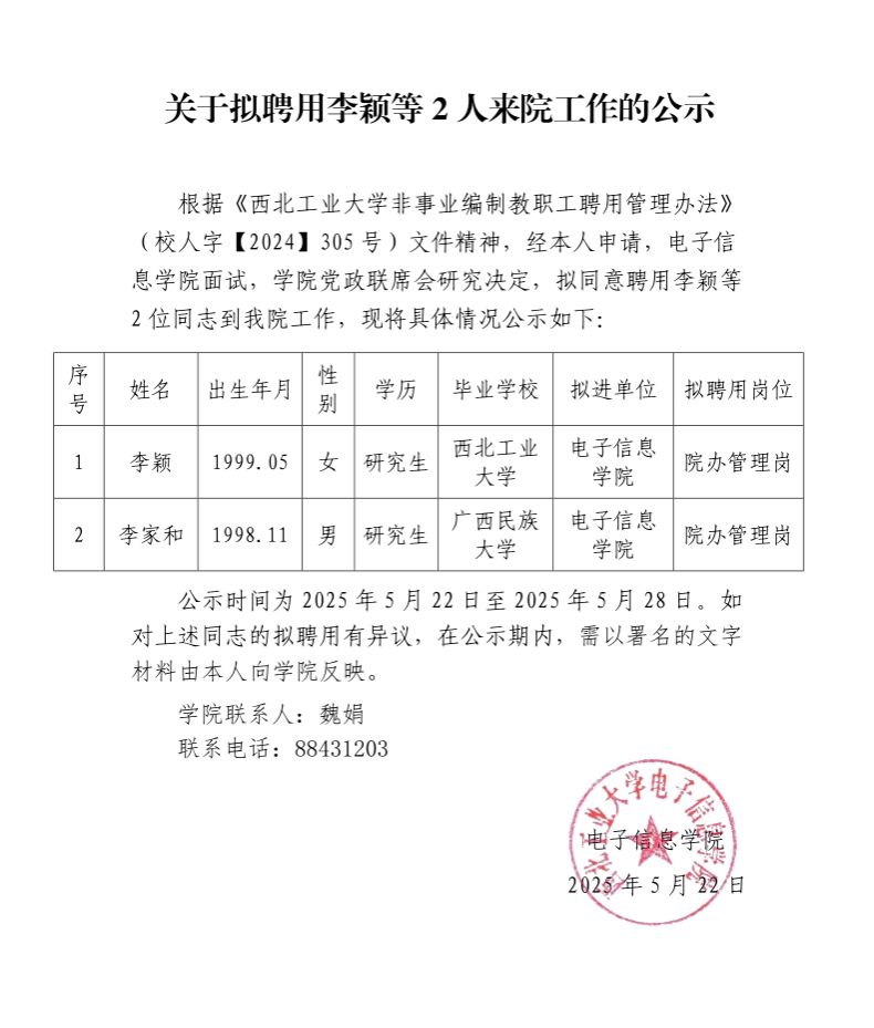 关于拟聘用李颖等2人来院工作的公示