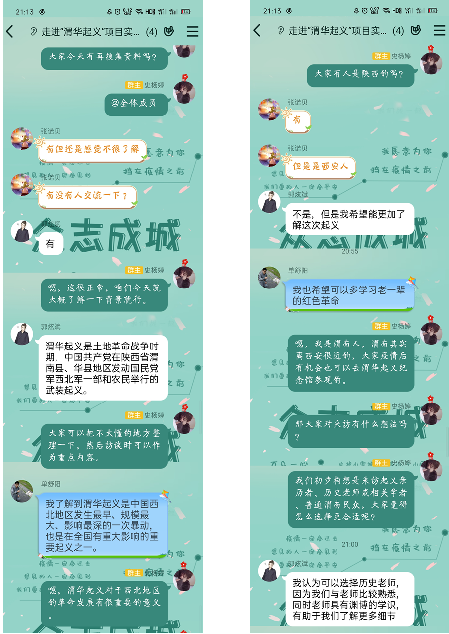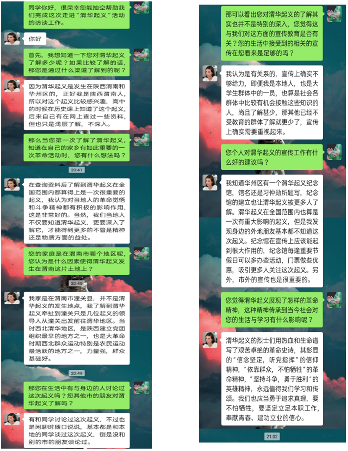 实践小队在这场短暂的社会实践中感受颇深。小队将整个活动分为三个部分:第一部分是对渭华起义文献和影视资料的收集与学习。第二部分便是我们的线上采访阶段了,一味地学习书本,到头来不过是“纸上谈兵”,“纸上得来终觉浅,绝知此事要躬行”,通过询问当地居民和老师,参观渭华起义的纪念馆,才能切身体会到革命先烈当时不屈的斗志与坚定的信念,燃起我们的敬佩之心。第三部分就是数据收集部分,通过线上问卷的形式收集足够的数据,在大范围上了解老员工对渭华起义的了解程度。最后总结和回顾实践中的收获与感受。