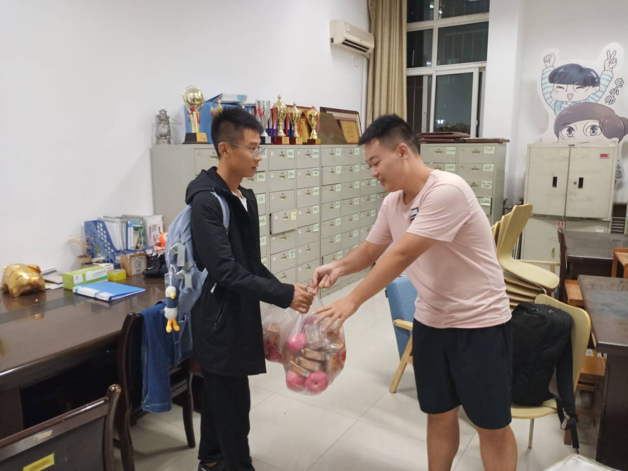 瞧,服务中心的暖心学长学姐们正给新生们发放月饼和苹果呢!月饼虽小,饱含心“芯”温情;苹果不大,倾尽满满祝福。