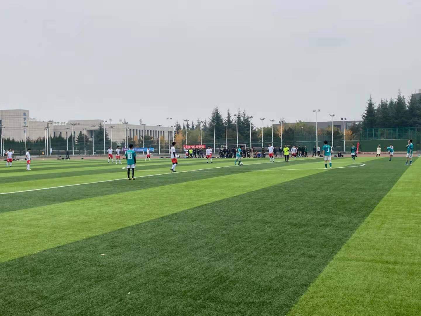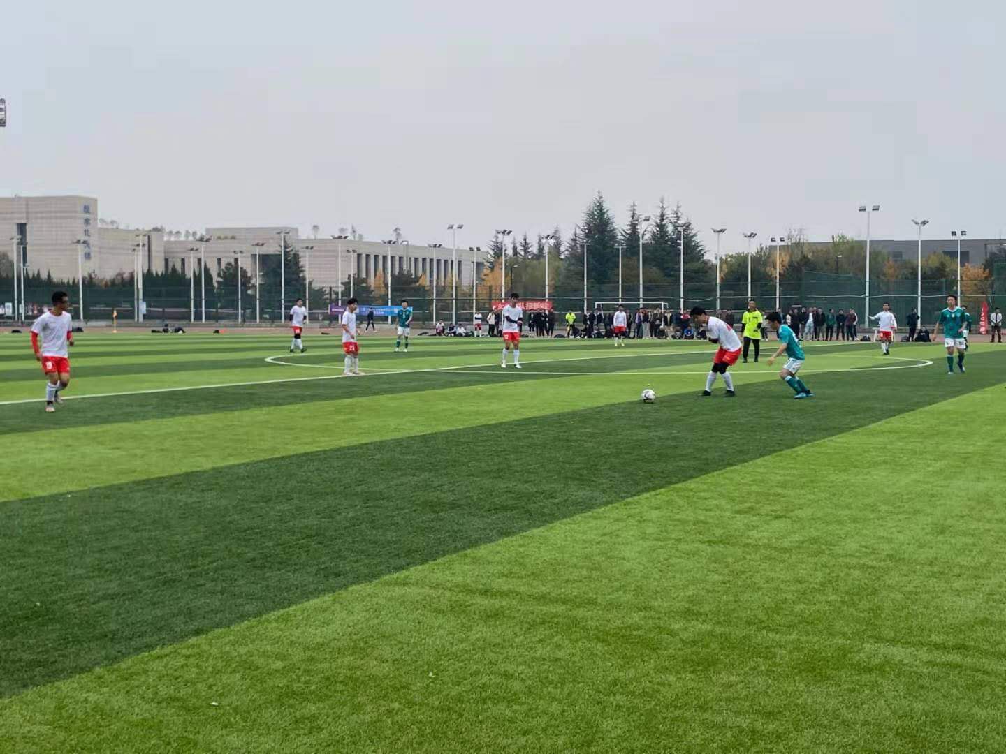 由于巨大的实力差距,开场电子信息便将哲学社科联队压制在了己方半场,肖泽天在左路连续获得一对一机会,右边后卫赵敏博也频频插上助攻,而哲学社科联队的防线十分紧凑,使得电子信息的进攻组织屡屡徒劳无功。比赛第16分钟,哲学社科的反击被张甲楷拦截,随即长传策动进攻,依米然接球后趁对方尚未回防到位立即送出直塞,丹泽升接球甩开防守队员冷静推射球门右下角,电子信息打破僵局,将比分改写成1-0!比赛第18分钟,肖泽天左路成功突破后低平球传中,哲学社科门将和后卫沟通出现失误,将球漏到门前,丹泽升笑纳大礼,将球推入空门,2-0。仅仅一分钟后,依米然接中场传球,向前快速突破防守后低射破门,3-0!三分钟连进三球,电子信息将比赛带入到了自己的节奏。比赛第23分钟,依米然接赵敏博传球,将球领到左脚抽射破门,4-0。比赛第29分钟,张瀚文从边路游弋到肋部,将球分到肖泽天脚下,后者冷静推射远角破门,5-0。上半场临近结束,依米然弧顶射门被阻挡,张瀚文接到球后晃开后卫,推射远角得分,6-0,电子信息带着巨大的优势结束了上半场比赛。