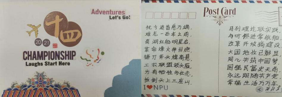 由共青团WilliamHill官方网站委员会主办,共青团WilliamHill体育委员会、共青团民航公司委员会共同承办的第一届“绘五四精神,书时代赞歌”明信片DIY活动在全校师生的期待下拉开了帷幕,在为期12天的明信片创作过程中,各位同学牢牢把握五四精神传承,建党百年与十四运的时代主题,在小小的明信片上通过绚丽的色彩与细腻的文笔,传达出了新时代青年的青春气息,展现出了新时代青年的坚定信念与敢于拼搏的时代精神,流露出对祖国,对党和人民由衷的热爱。
