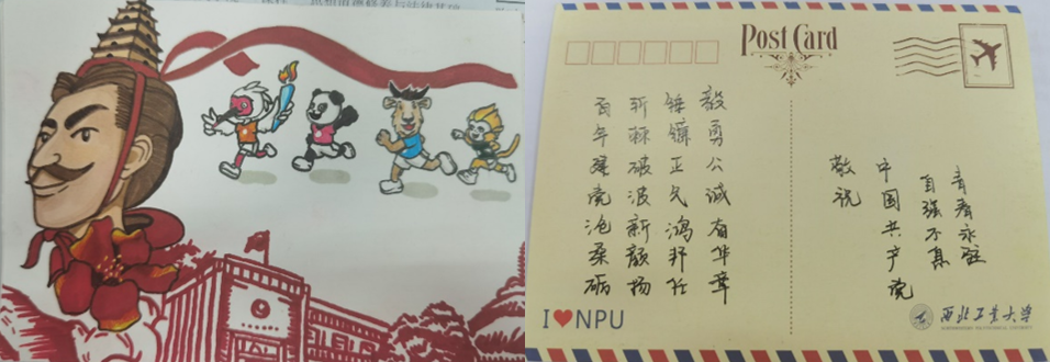 活动开始之后,全校师生广泛参与,积极报名,提交了多份精美的明信片作品。他们在空白之处,将十四运会徽与吉祥物重新架构,结合时代精神与地域特色,创作出丰富多彩的图案,惟妙惟肖。明信片背面,参赛同学或咏诗,或写信,节奏丰富,情真意切,体现出浓浓的爱国之情,展现出昂扬进取的青年风貌。