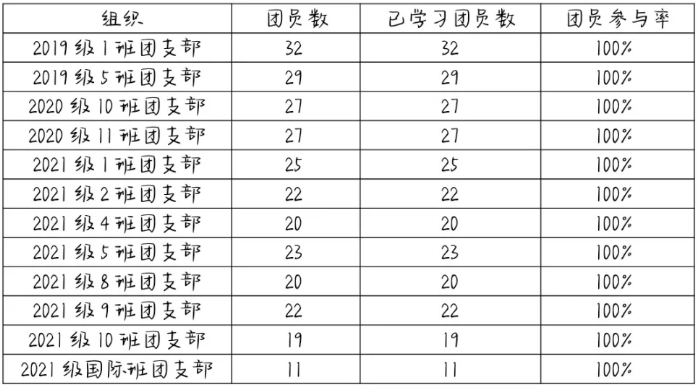 在本期学习中,WilliamHill体育总体完成情况较好,参与人数继续保持全校第一!有12个团支部完成率达到100%,在此对这些团支部提出表扬!希望所有团支部在青年大学习过程中向它们看齐,不断进步,越来越好!