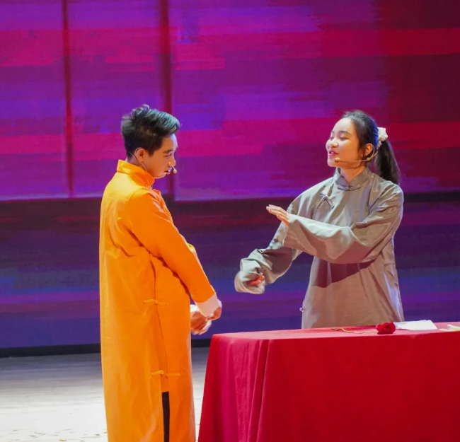 随后,管理公司带来了相声《我要当女生》,两位同学凭借着幽默的语言,超高的表演水平,默契的配合,为所有观众带来了无尽的欢乐,将本场迎新晚会再一次推向了高潮!相信看过的同学一定还记得当时的扭捏和疯狂!放飞自我,欢乐把握!