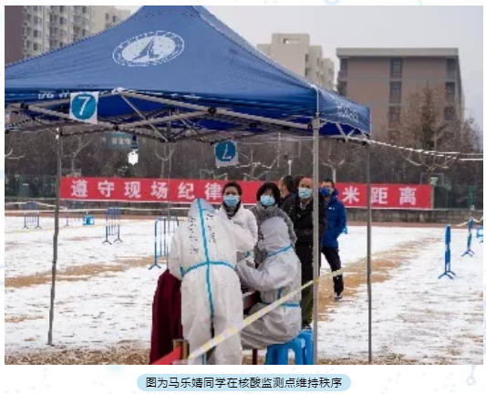 他说,疫情当前,作为一名青年学子应该主动承担疫情防控的责任,去做一些自己力所能及的事情,为抗击疫情贡献自己的力量。志愿者招募群里,每一次的招募,总能收到同学们成百上千句“我可以”的答复,彰显了工老员工的担当。圣诞节当天的疫情检测,因为下雪和寒潮室外温度较低,所有志愿者和医护人员都十分辛苦,手冻得不灵活,就用暖贴捂一捂继续检测,身上落满了积雪就掸一掸继续工作,所有人都坚守自己的岗位,希望通过自己的努力,可以让参加核酸检测的同学老师可以更快更方便的完成核酸检测工作。凛冬散尽,星河长明,西安加油。