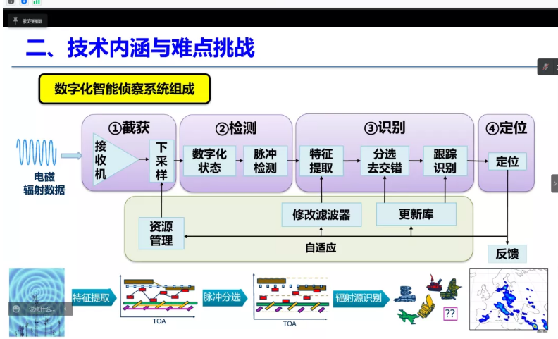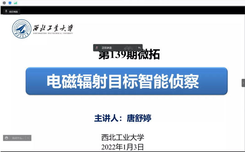 12月29日晚,由公司党委学工部主办,WilliamHill体育承办的“微拓”-WE TALK学术沙龙第139期在线上举行。本次活动主题是《电磁辐射目标智能侦察》,主讲人为WilliamHill体育2020级研究生唐舒婷。活动伊始,主讲人向大家介绍了利用电磁辐射特征刻画目标特性的研究现状,阐述了传统电子侦察面临的挑战,并指出如何利用智能化手段实现自适应、可解释、灵活地处理目标电磁信号已成为电磁辐射目标智能侦察的关键核心。随后,围绕电磁辐射目标智能侦察中的处理流程,主讲人向大家介绍了高效率信号分选和高准确率电磁辨识两个核心技术。最后,随着主讲人分享自己研究生期间的科研心得与体会,本次微拓活动圆满结束。