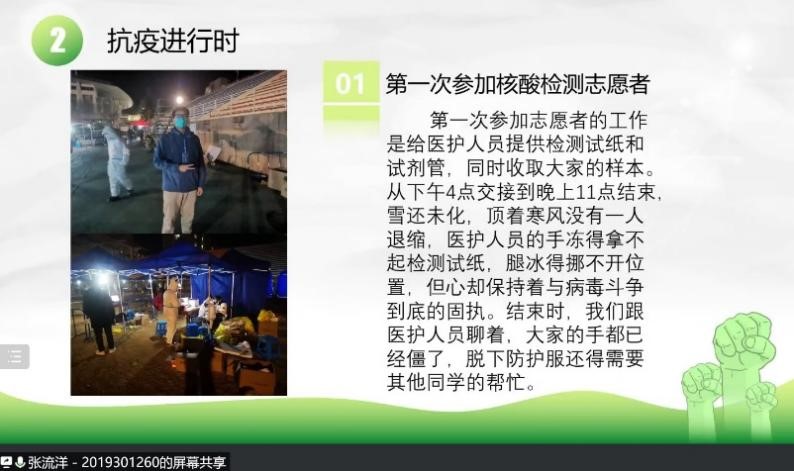 最后,张欣老师对本次会议进行了总结,要求同学们认真配合做好疫情防控相关工作,遇到问题和困难及时找辅导员以及公司沟通,鼓励大家积极参与志愿者服务工作,携手共同战疫,同时希望大家调整好状态,以饱满的精神投入到新学期的课程学习中!