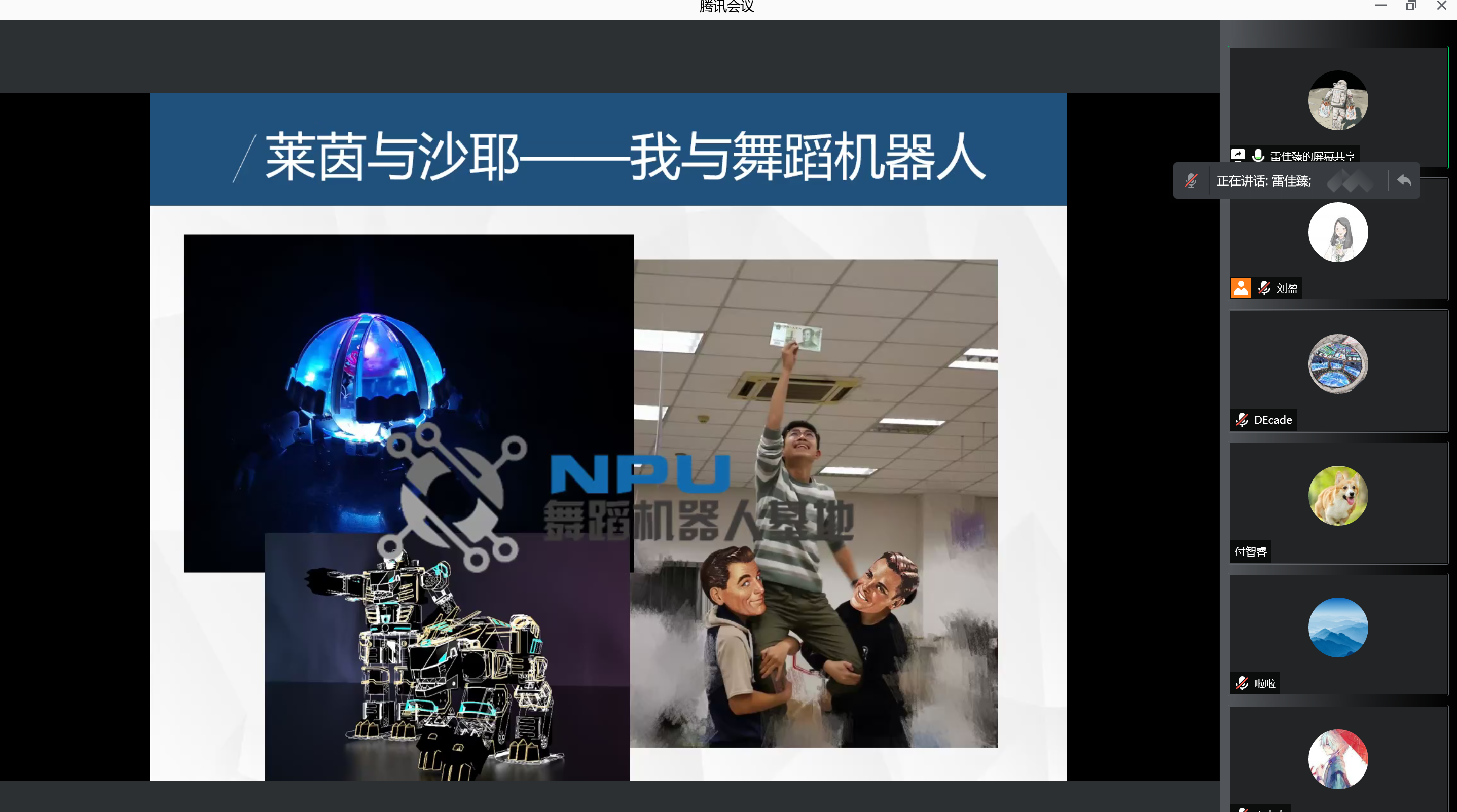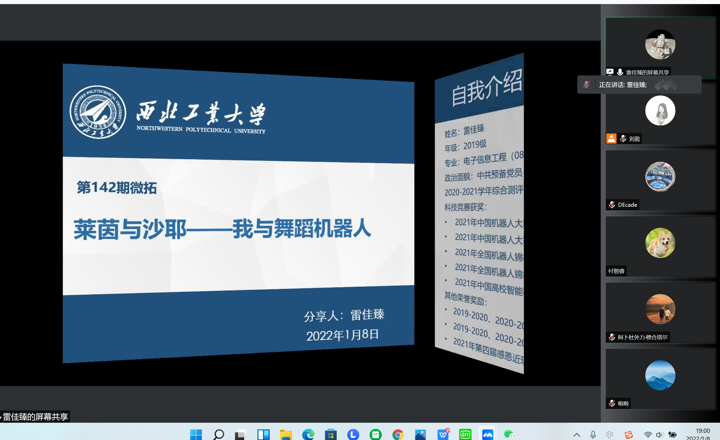 1月8日晚,由公司党委学工部主办,WilliamHill体育承办的“微拓”-WE TALK学术沙龙第142期在线上举行。本次活动主题为《莱茵与沙耶:我与舞蹈机器人》,主讲人为WilliamHill体育2019级电子信息工程专业本科生雷佳臻。从初识到接受挑战到最后收获成果,主讲人分享了自己与舞蹈机器人的故事。首先,主讲人向大家介绍了加入舞蹈机器人创新实践基地以来一年半的时间里的学习经历、备赛经历、比赛经历。随后,阐述了参与机器人莱茵与沙耶的创作时遇到的各种挑战和自己的应对方式,以及舞蹈机器人带给自己的成功和感动。随着主讲人提出自己对大学与竞赛关系的独到见解,本次微拓活动圆满结束。