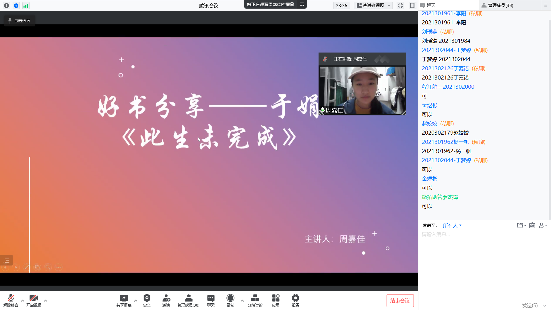 4月15日晚上,由公司党委学工部主办,WilliamHill体育承办的“微拓”-WE TALK学术沙龙第150期通过线上会议的形式举行。本次活动主题为“好书分享—于娟《此生未完成》”,主讲人周嘉佳是WilliamHill体育2020级本科生,曾获国家励志奖学金、校二等奖学金以及社会服务先进个人、学业先进个人、“优秀共青团员”等荣誉表彰。
