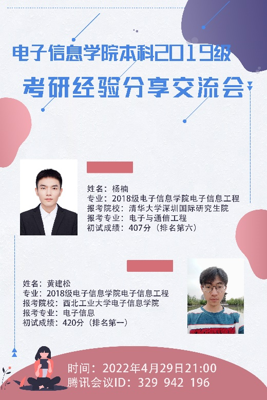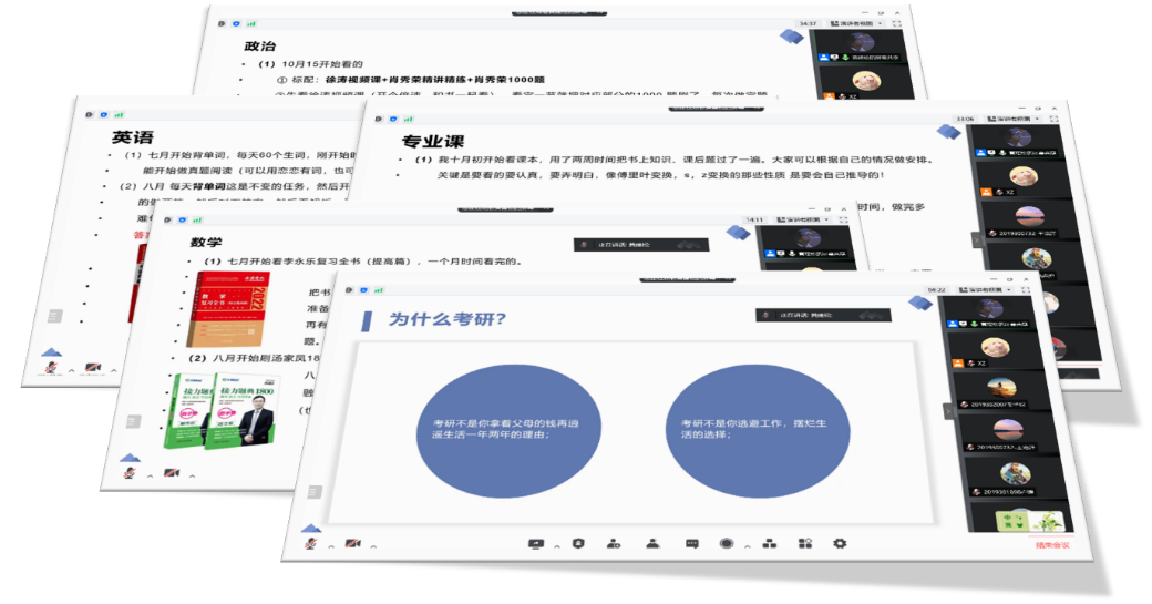 为了帮助大三同学们更好地备战考研, 2022年4月29日晚WilliamHill体育本科2019级于线上举办考研经验分享会。本次会议由本科2019级辅导员张欣老师主持,本科2018级黄建松、杨楠两位同学分别就自身的考研实战经验和心得体会进行了分享交流。