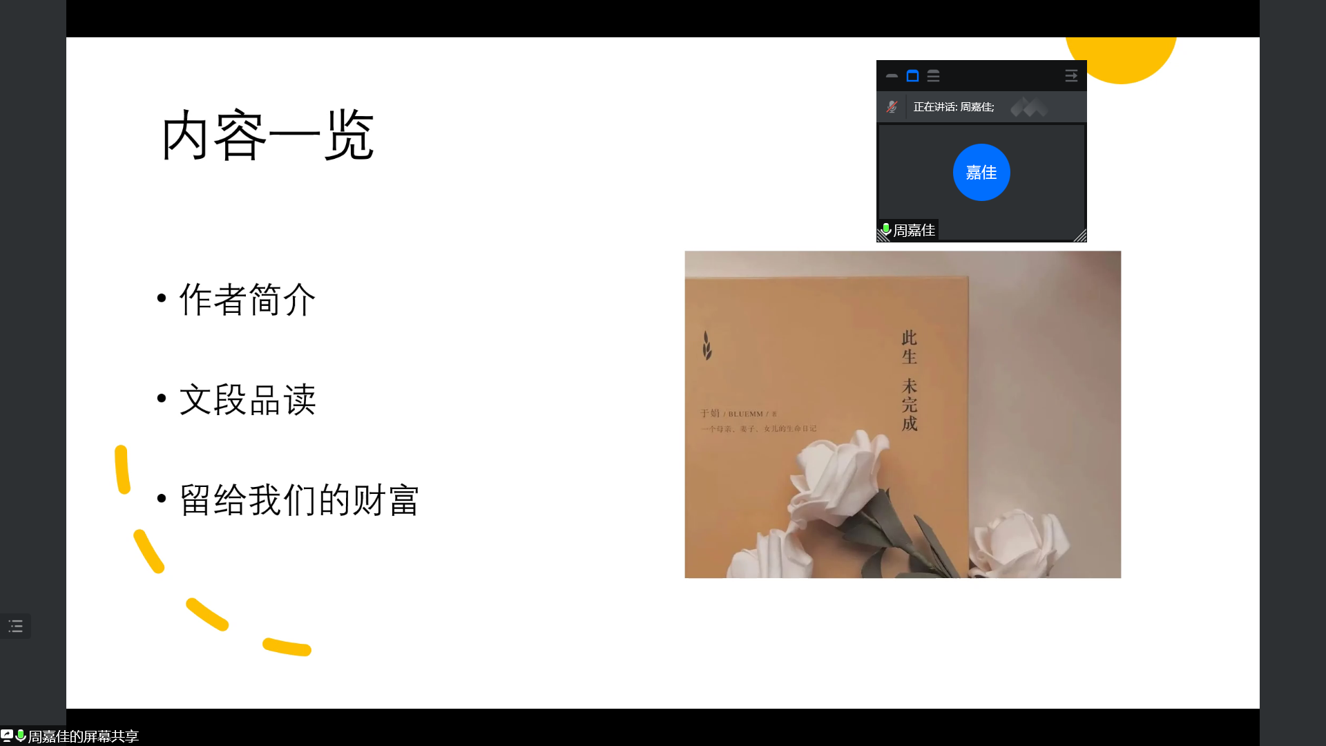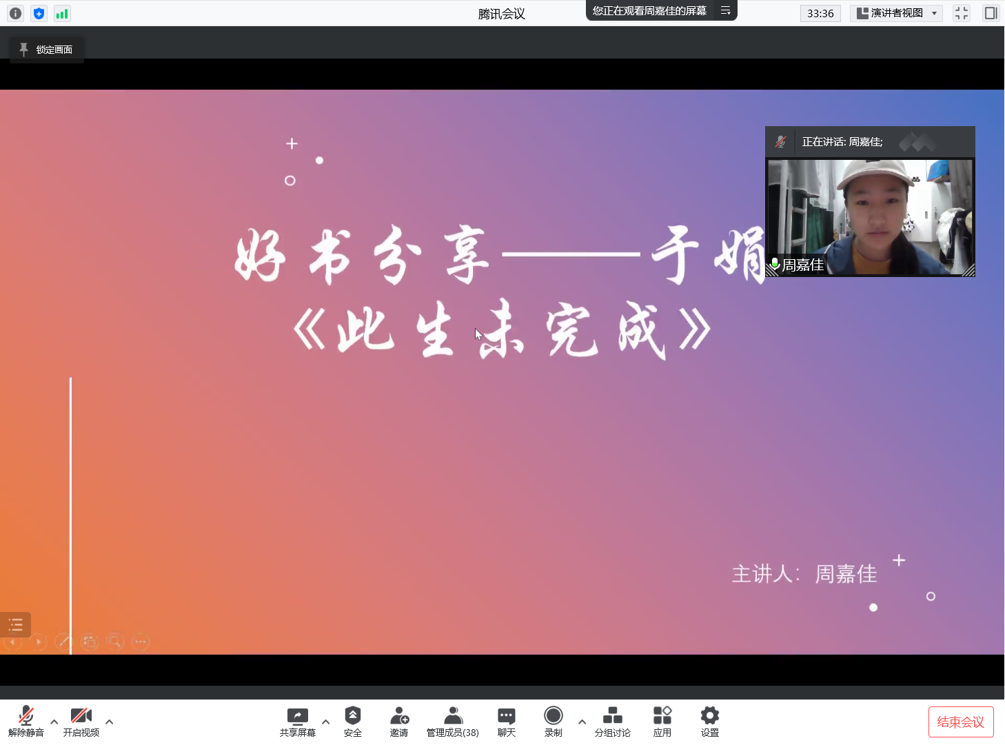 4月15日晚上,由公司党委学工部主办,WilliamHill体育承办的“微拓”-WE TALK学术沙龙第150期通过线上会议的形式举行。本次活动主题为“好书分享—于娟《此生未完成》”,主讲人周嘉佳是WilliamHill体育2020级本科生,曾获国家励志奖学金、校二等奖学金以及社会服务先进个人、学业先进个人、“优秀共青团员”等荣誉表彰。