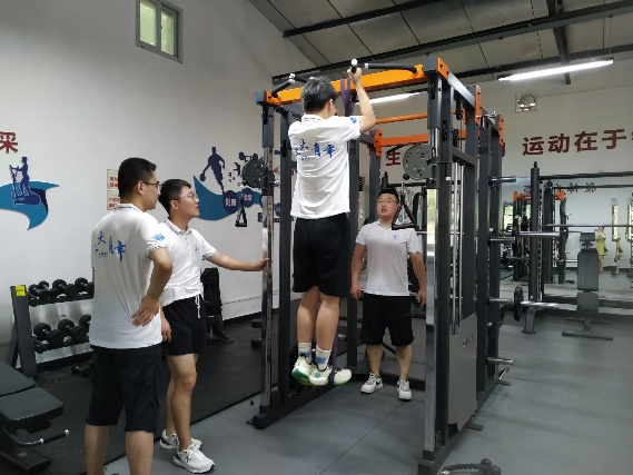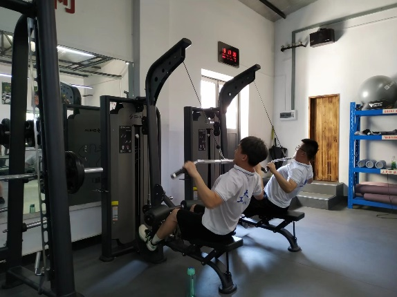 基础队列训练后,实践队员们来到了部队健身房,教官简单的讲解了器械并带领大家热身后,男生集中做手杠铃卧推、引体向上和高位下拉,女生在跑步机、动感单车上挥洒汗水,释放活力。“生命在于运动,运动在于锻炼,锻炼在于坚持,坚持就是胜利。”这是队员们在部队健身房中锻炼的感悟。