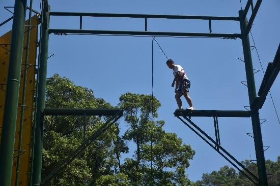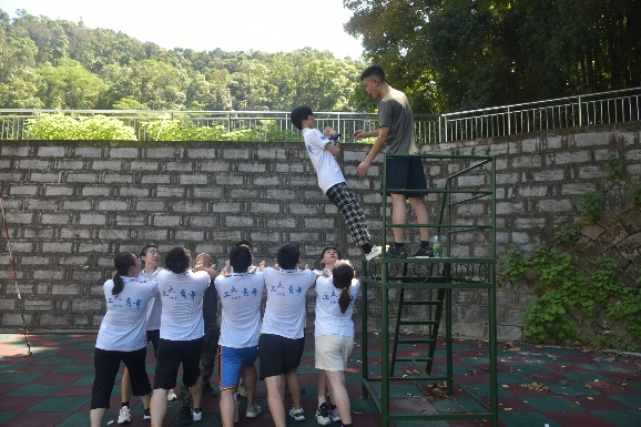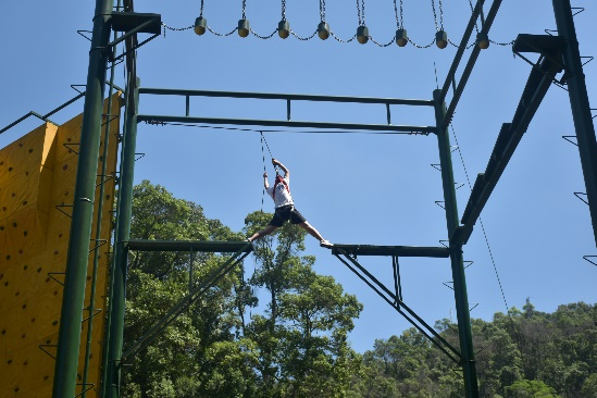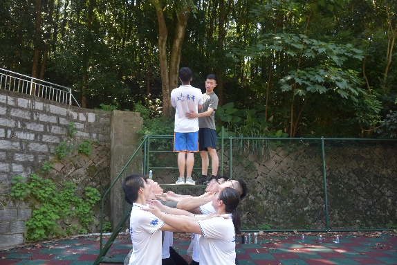 第二项内容为“高空断桥”。队员们系上安全绳,爬到数十米高的训练台上,站在狭窄的训练台,钢制的架子随身体摇晃,断桥的距离在高空环境下显得遥不可及,大家互相鼓励,一跃而起,在空中画出一条优美的弧线。到达断桥到达另一端后速降至地面,速降中,队员们呼喊着表达克服恐惧的兴奋。经过一个下午的训练,实践队的凝聚力得到了显著的提高。