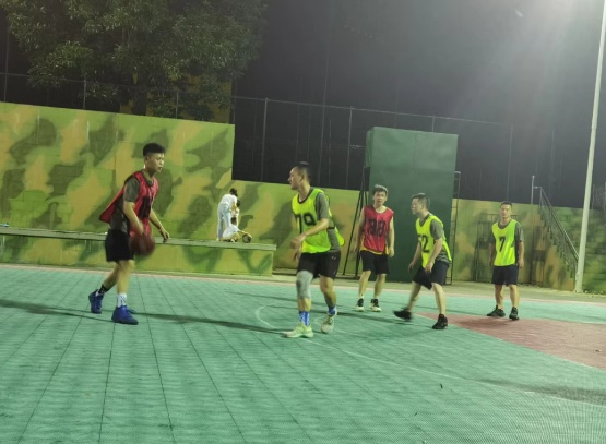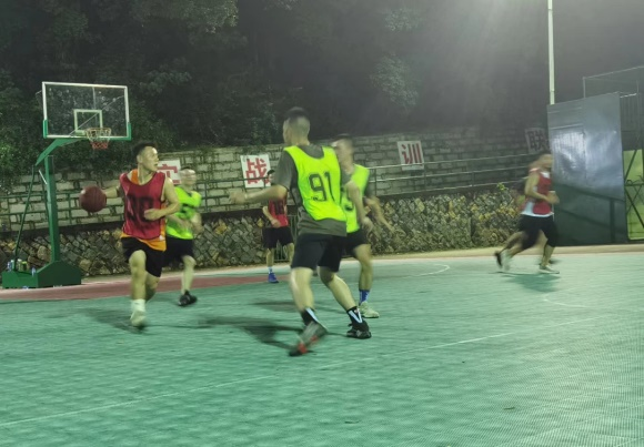 傍晚,篮球友谊赛如期举行,现场气氛热烈,高潮迭起。中场休息时,女队员也来到球场投篮,积极参与到赛事当中。