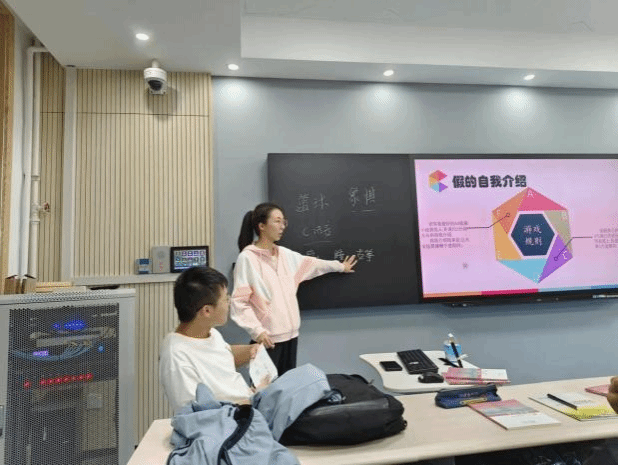 回顾自己的人生,在黑板上写出3个自己的爱好,但是3个词中要有1个是假的,把自己的三个爱好展示给其他人,并进行2分钟左右的自我介绍,自我介绍结束后,让大家投票猜哪个是假的。