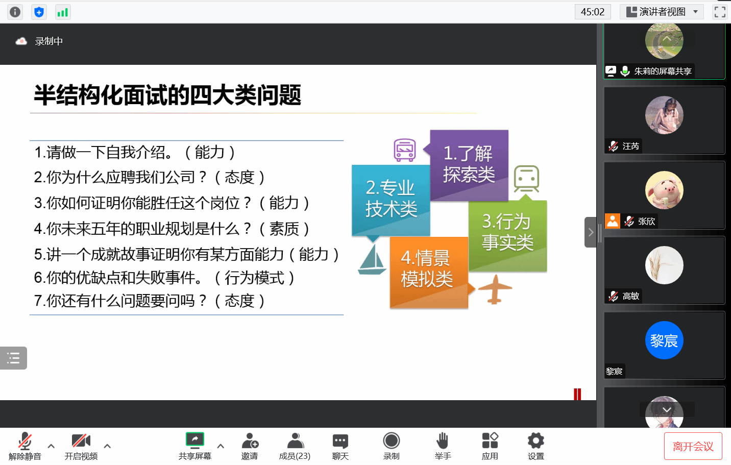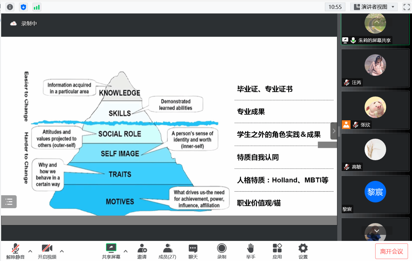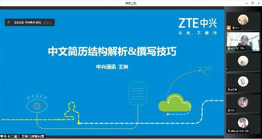 公司邀请中兴通讯HR王琳老师,结合自身实际经验,开展了一次主题为“中文简历结构解析与撰写技巧”的线上分享交流活动。王老师首先从制作简历的常见问题入手,提醒同学们在制作简历的过程中要避免出现缺乏针对性、职业路径混乱等问题,然后剖析了典型的简历结构,指出一份完整的求职简历应该至少包括基本信息、求职意向、教育背景、项目实践经历、专业技能和荣誉成果等部分,并带大家了解在线简历的投递渠道,如前程无忧网、智联招聘网、中华英才网等。