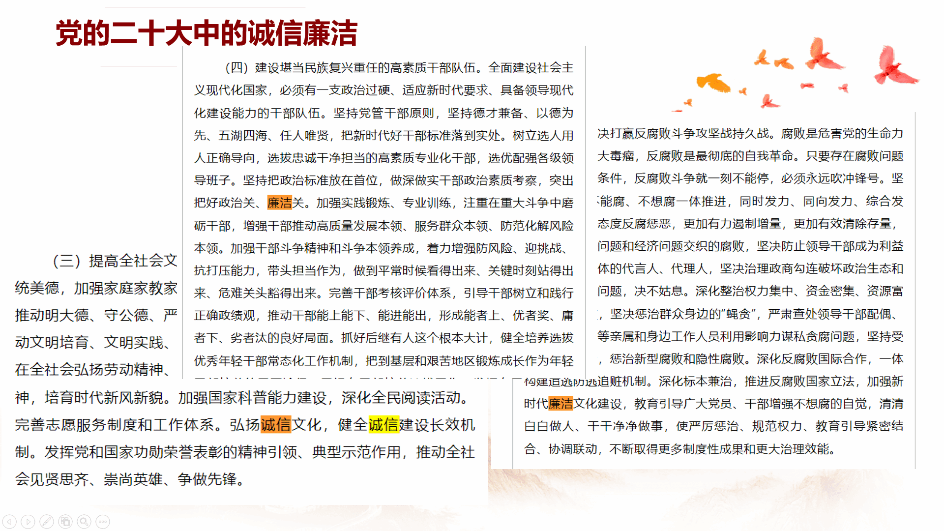 陈学润同志以西工大校训着手,引出作为一个西工大学子,我们应当做到“诚实守信,襟怀坦荡”。然后结合党的二十大中有关廉洁诚信的部分,以及社会主义核心价值观中对个人的要求,提出廉洁诚信应当是每一个人都应该具有的优良品质,也是社会和国家对我们的要求。随后陈学润同志列举出了一系列违反廉洁诚信的案例以及WilliamHill官方网站出台的关于考试作弊处分办法,希望党员同志们引以为戒,做一个廉洁诚信的合格党员。