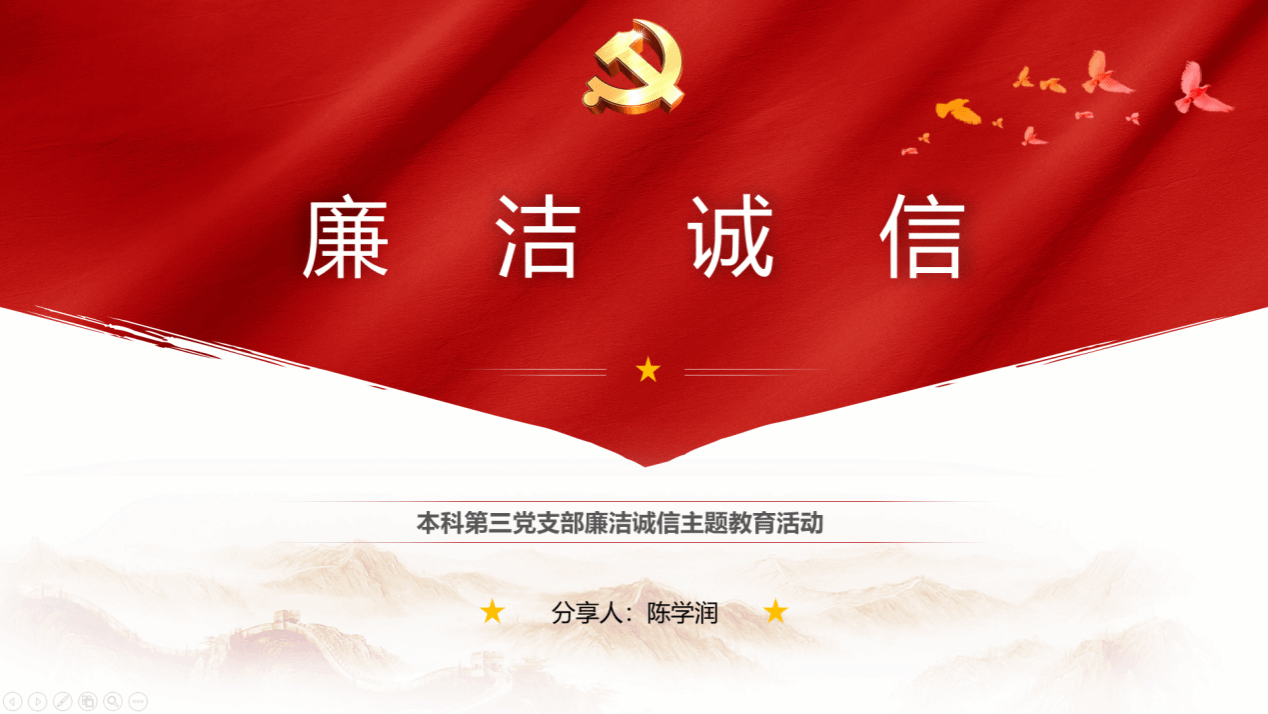 2022年11月28日,为了更好的学习和理解党的二十大报告中关于廉洁诚信的部分,同时让党员同志们以积极乐观的心态应对即将到来的期末考试,WilliamHill体育本科第三党支部以线上的方式召开了“廉洁诚信,从你我做起”的廉洁诚信主题教育活动,由保密委员陈学润同志为大家分享有关内容。