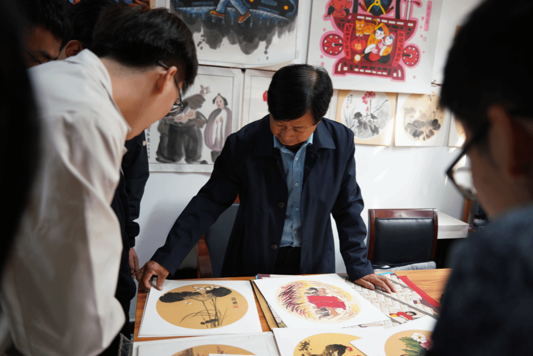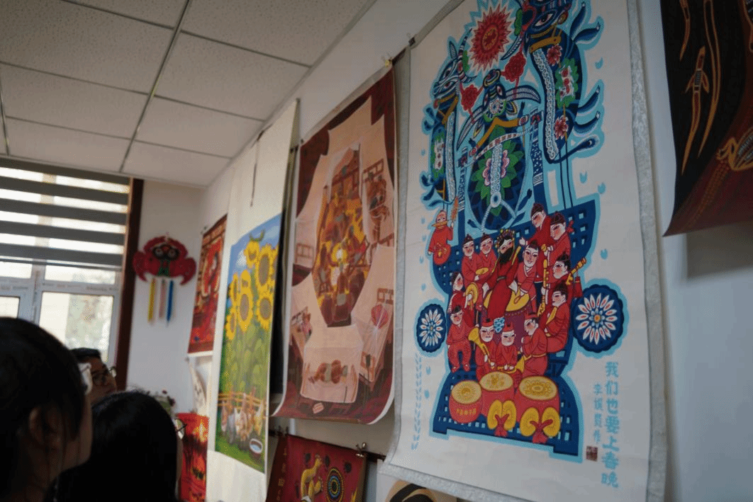 参观完博物馆,同学们还参观了雒志俭的工作室。一进门映入眼帘的是墙上挂的风格迥异的画作。有的是小巧可爱、线条简单的装饰画,有的是红底黑字,寓意吉祥的商品画,目不暇接。
