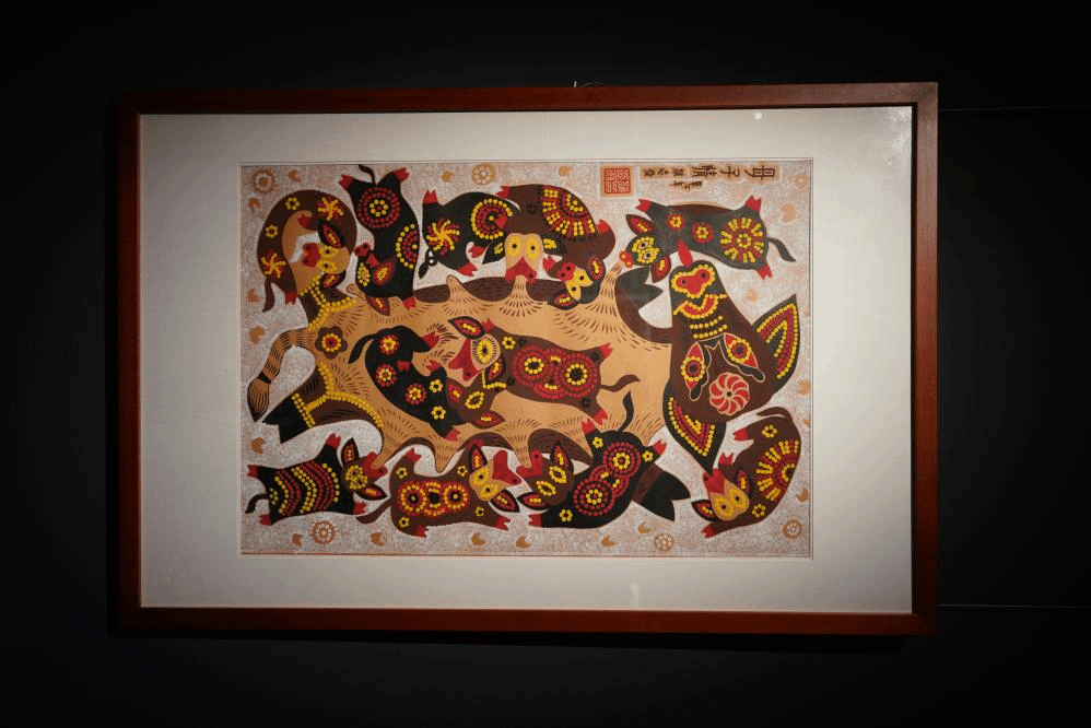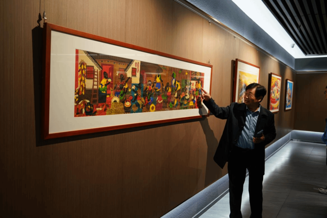 在画展一楼的核心区域,一张张农民画出现在同学们眼前。在明媚的秋日,能比湛蓝的天空和金黄的银杏叶更璀璨的,是农民画浓重的色彩,饱满的布局,以及那细腻而又不失张力的线条。通过讲解同学们得知,农民画地域特色鲜明,画面简洁而饱满,想象大胆丰富,风格浪漫稚拙,是中国绘画史上不可多得的素材源泉。