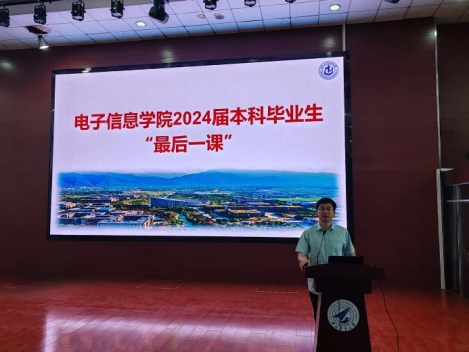 6月26日上午,电子信息公司党委书记侯俊在教西D100为2024届本科毕业生讲授了题为“扬帆启航新时代·青春奋斗正当时”的“最后一课”。辅导员赵洪钢和全体2024届本科毕业生出席。活动由公司党委副书记高敏主持。