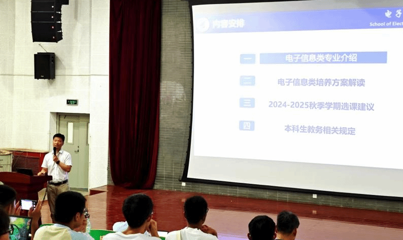 高永胜围绕电子信息大类专业介绍、培养方案解读、秋学期选课建议及本科生教务相关规定四个方面,宏微相济地为新生介绍专业学什么、怎么学,引导员工科学合理安排学业计划。各专业负责人及骨干教师分别围绕各专业学科内容、建设现状、就业方向及未来发展趋势等进行介绍说明,缓解新生对学科专业的迷茫,同时引导同学们做好自我未来规划,为日后更好地投入专业学习奠定基础。杨瑾针对新生关心的选课原则、选课流程等问题进行逐一解答与指导。