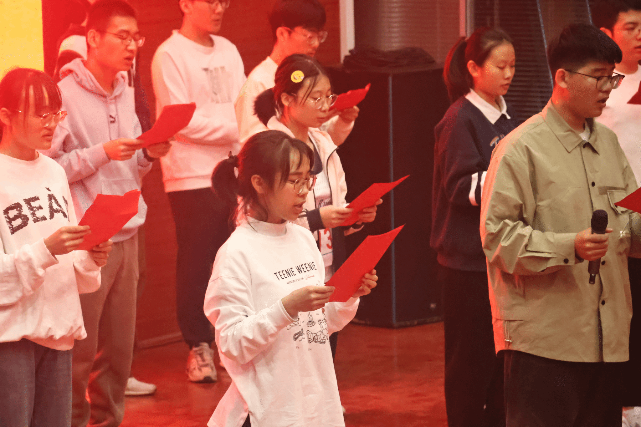 各班的风采展示分为两部分。在班级表演部分,各班精心准备,通过合唱、朗诵、手语操、情景表演等多样形式展现班级风貌及团体凝聚力。4班慷慨激昂地朗诵李大钊的《青春》,唤醒青年之志;2班将手语操《国家》和诗朗诵《红烛》相结合,展现了团队协作精神和对国家的热爱;5班通过情景表演《寻李白》,表达对古代文人志士的赞美和对乐观自信的人生态度的追求。