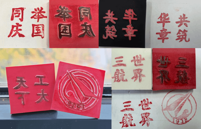 随后,由公司员工雕刻协会负责人王皓然讲授橡皮章雕刻技巧。王皓然同学从制作实践出发,深入浅出地讲解了雕刻的基本原理、执刀手法、雕刻技巧等内容,并以“中”字为例为同学们演示雕刻过程,并鼓励大家要科学操作,也要敢于实践。随后,同学们按照讲解内容进行练习体验,利用橡皮章刻制了“共筑华章”“盛世中华”“国泰民安”“天下工大”“世界三航”等内容。