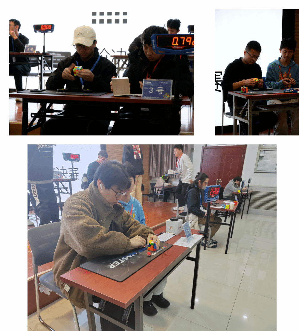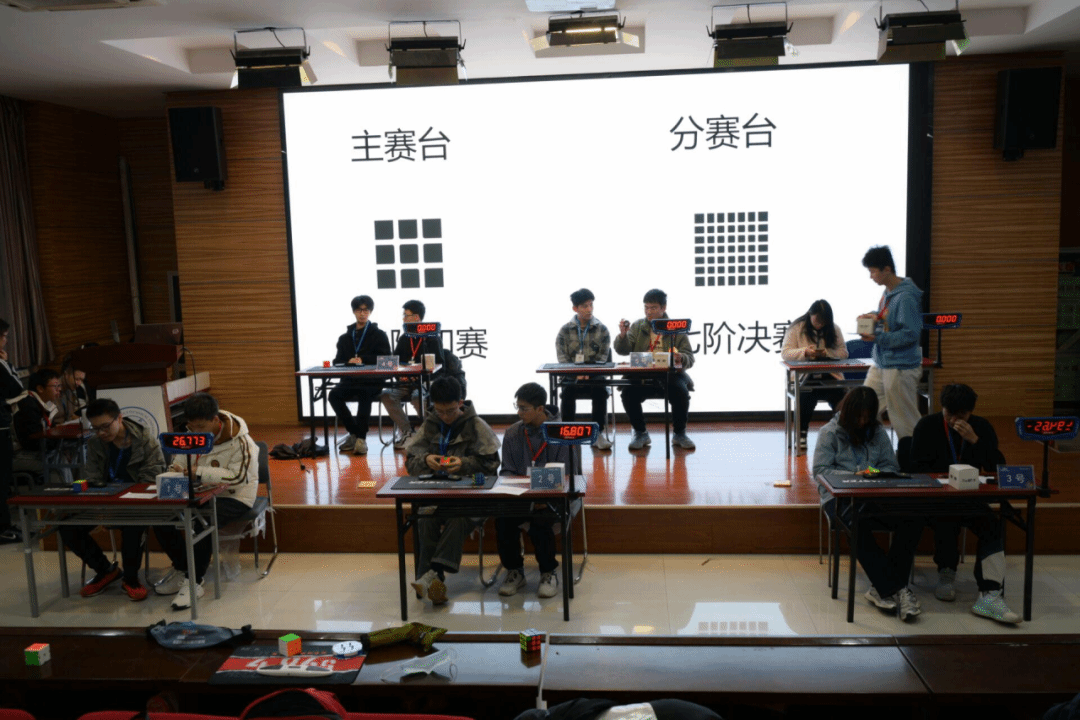本次校园魔方赛参照WCA的赛程,场地内设有主赛台,分赛台,打乱区和签到处。选手凭参赛证入场,并在裁判的引导下进行比赛。整个比赛流程规范有序。