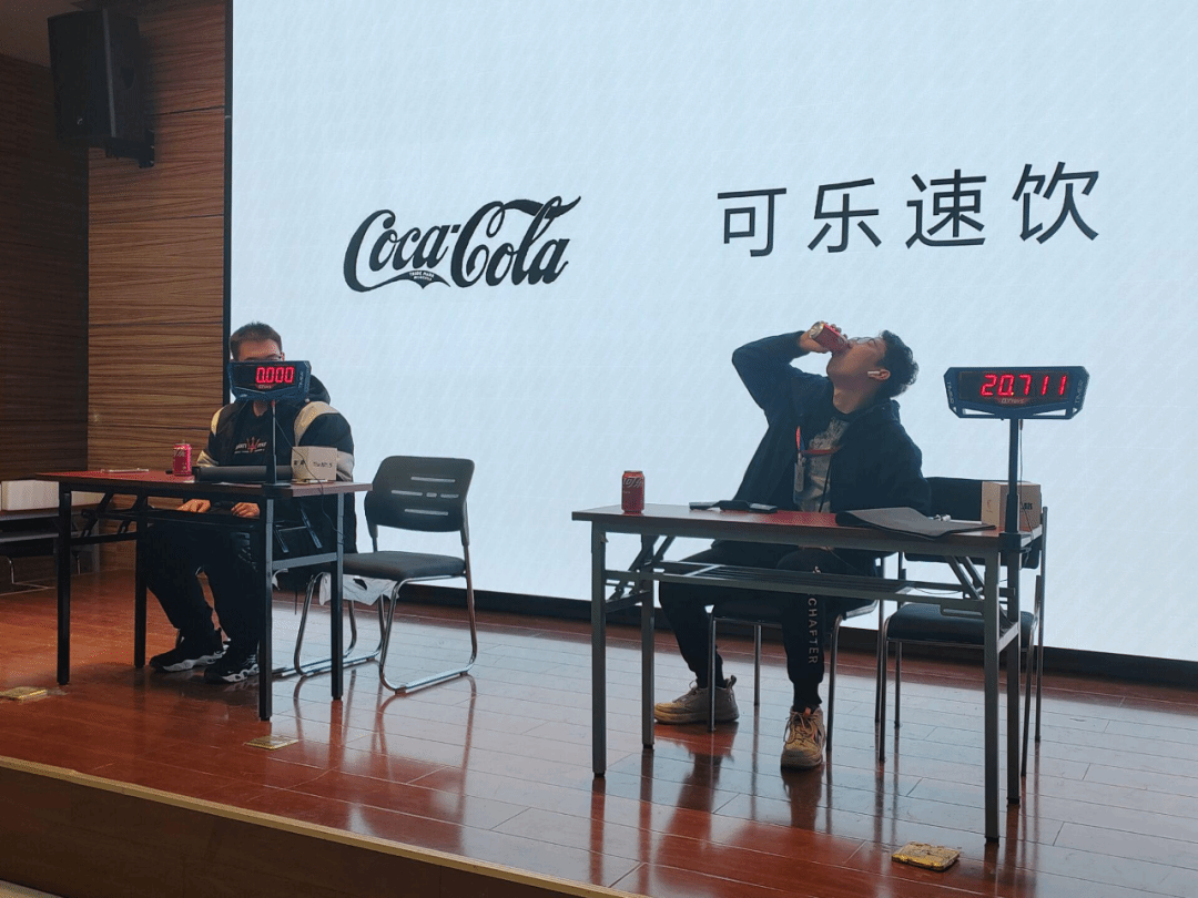 除了紧张刺激的竞速项目,本次比赛还设置了供大家休闲娱乐的可乐速饮环节。在欢快轻松的氛围下,选手们将赛台上的碳酸饮料一饮而尽,为赛场带来了不少的欢声笑语。