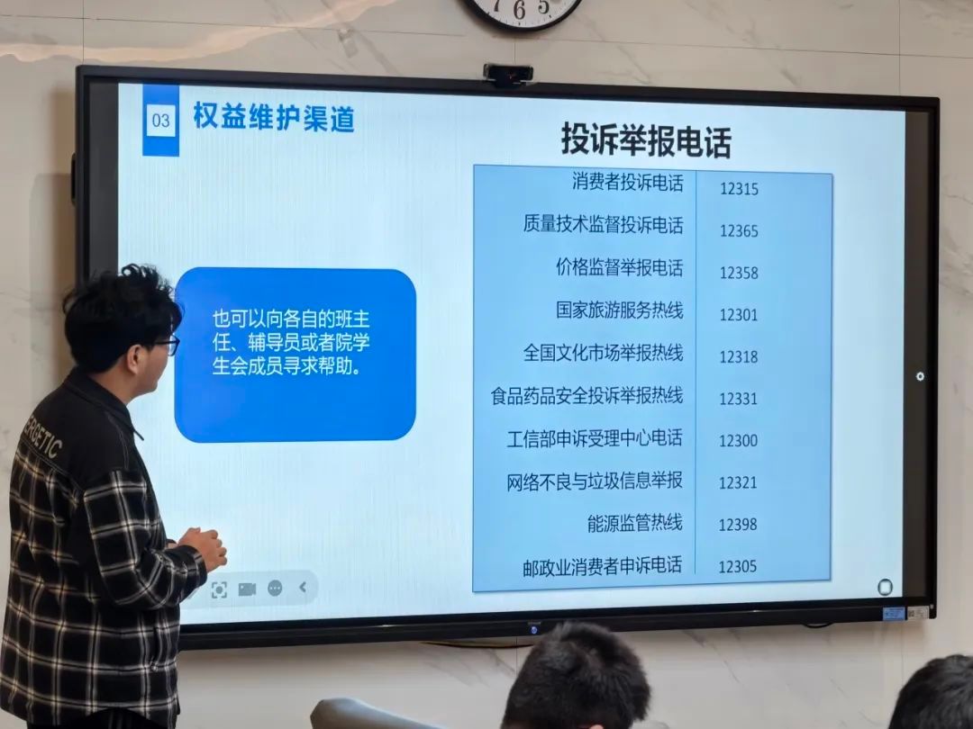 主讲人强调,除了了解侵权案例,掌握维权手段同样重要。主讲人提供了针对公司同学的多种维权渠道,包括翱翔门户留言板,院、校员工会权益反馈问卷等,以便同学们能够及时反馈问题。此外,主讲人还给同学们提供了一系列投诉举报电话,如消费者投诉电话12315等,以便在遇到问题时能够迅速寻求帮助。