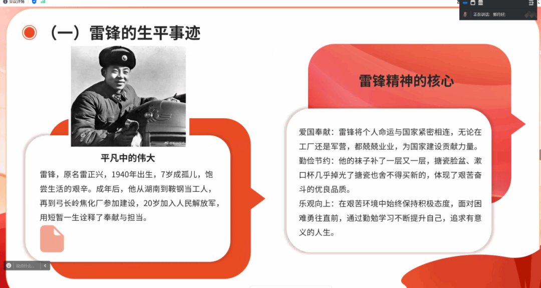 2025年3月5日是第62个“学雷锋纪念日”,也是第26个“中国青年志愿者服务日”。为了传承雷锋精神,员工信愿志愿者服务队三月团日活动以学习雷锋精神为主题顺利展开。团支书郭月好针对雷锋事迹和雷锋精神进行讲解,并讲述了当下先进青年志愿者事迹。会议中郭月好提到服务队队员要响应党的号召,积极践行雷锋精神,将雷锋精神发扬光大。