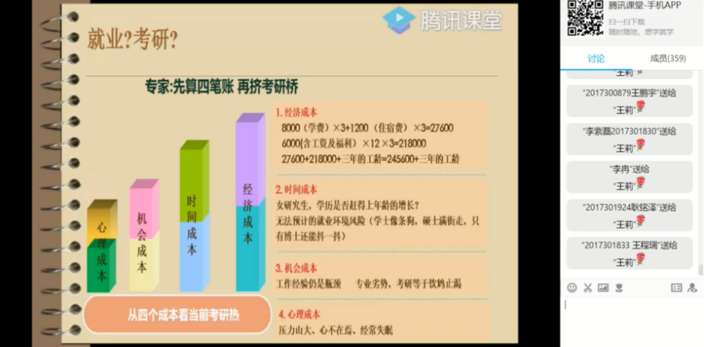 王莉老师主要从如何选择就业或考研、如何正确看待考研以及如何做准备三个方面进行了讲述。在如何选择就业或考研方面,王莉老师首先列举了大部分同学的疑惑,随后从经济成本、时间成本、机会成本和心理成本对考研的成本进行了分析,并指出真正的问题不在于如何选择,而是做了选择之后如何去行动。