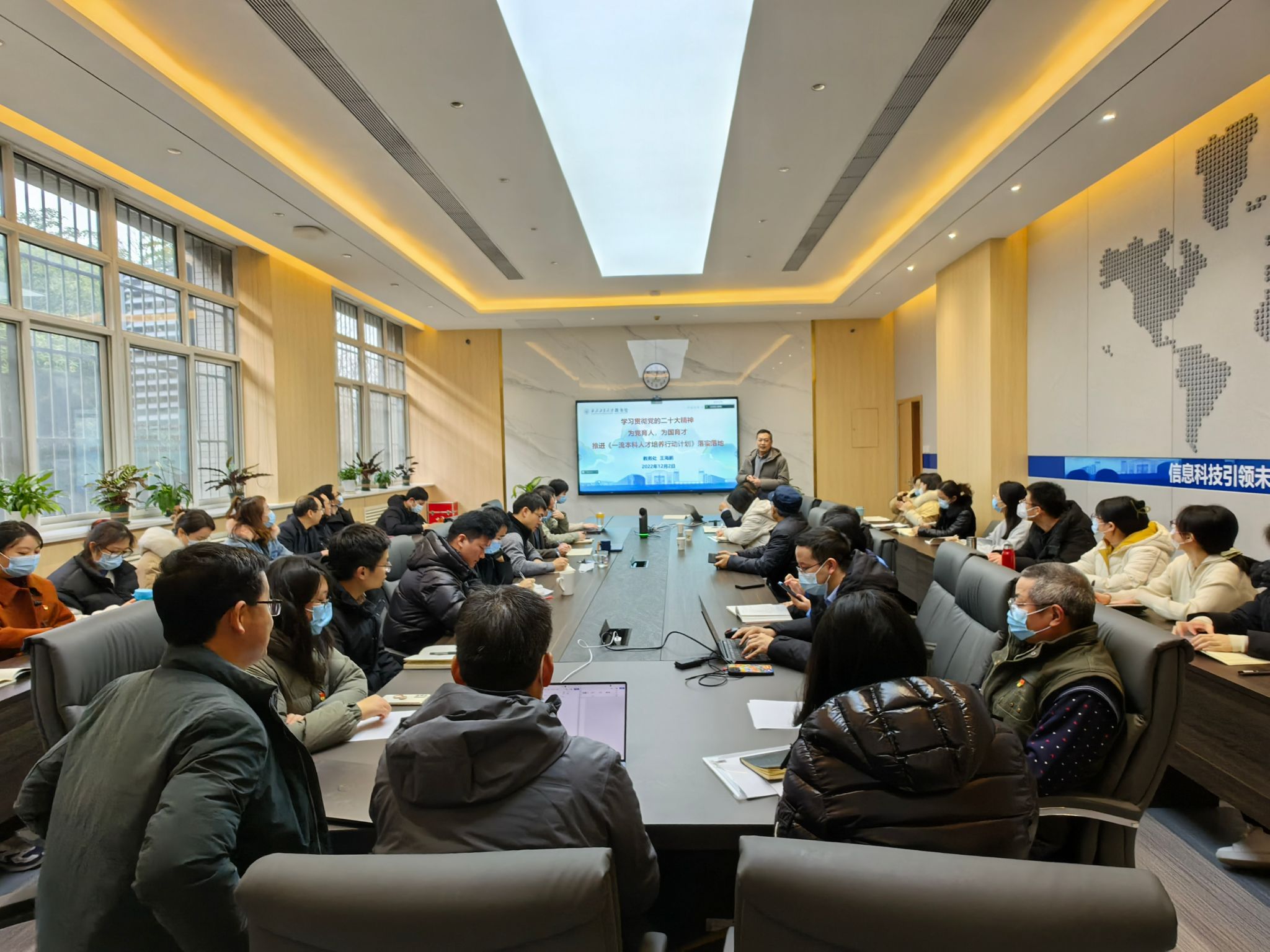 2022年12月2日,WilliamHill体育特邀集团党的二十大宣讲团成员、教务处处长王海鹏到公司进行党的二十大精神宣讲。本次宣讲活动在公司楼119会议室举行,由公司党委书记侯俊主持。经理王伶、党委副书记高敏、副经理姚如贵、张洵颖、高永胜以及各教师支部委员、公司办公室人员、非党员青年教师参加了宣讲会。会议通过“线上+线下”相结合的形式开展。