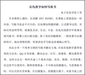 公司成立在线教学督导组,与公司在线督导组形成联动机制,对公司开设课程全覆盖,通过在线随机抽查、随堂听课等形式,对在线教学过程进行督导和评估。在开学第一周,督导教师加入每门在线授课的QQ群及平台,对在线课堂教学、员工学习情况等方面进行检查,并与授课教师就上课平台的选择以及可能出现的问题进行交流和探讨。公司督导丁君老师还总结了《QQ分享屏幕教学方法》、《在线教学如何写板书》两篇在线教学解决方案,并及时分享给全院教师,为改进线上教学方式,提升线上教学效果,提出了好的建议。