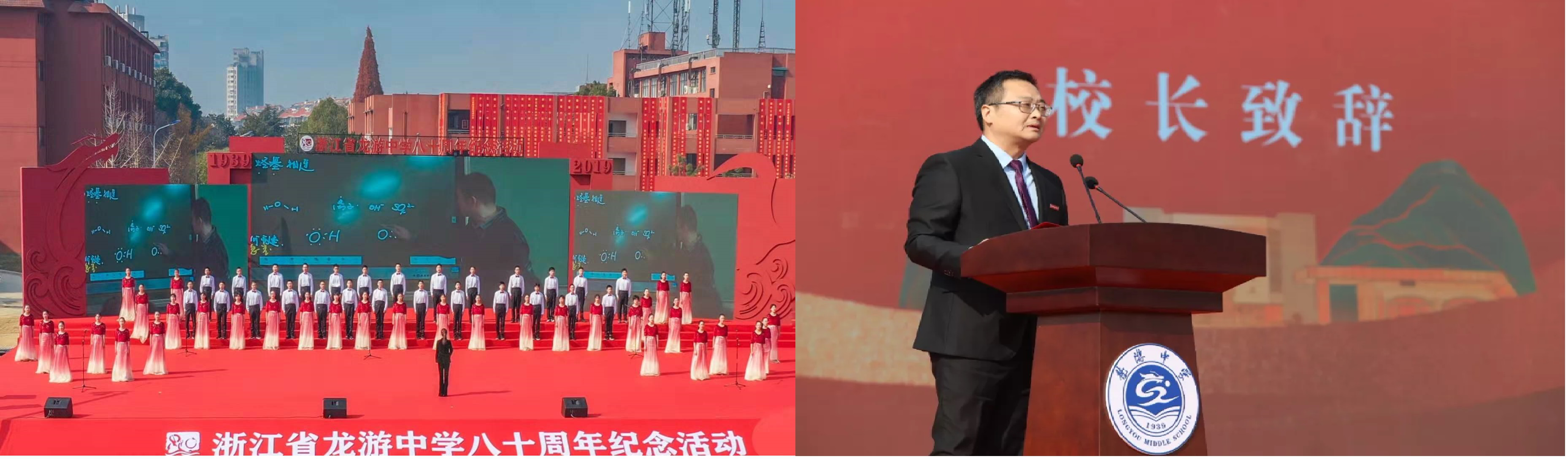 和风暖日,鸡鸣山下喜迎四方宾朋,2019年12月15日上午9时30分,浙江省龙游中学“感念龙中 有你有我” 建校八十周年纪念活动在校运动场主会场隆重举行。精彩的开场节目过后,龙游中学董事长吴焕斌致欢迎辞,对莅临本次大会的领导、来宾和员工表示了衷心的感谢。传承唯诚求实精神,培育本真大器新人,在龙游中学建校八十年之际,吴董事长回顾了八十年来的坎坷历程,展望了公司未来的发展蓝图。公司发去了贺信,表达了公司对龙游中学80周年华诞的热烈祝贺和诚挚祝福,并派浙江招生宣传组成员冯琦老师参加庆典活动。