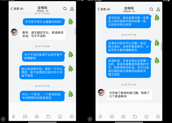 “我对接帮助的是一个小学二年级的小男孩,得到联系方式后,我立刻与孩子家长通了电话以了解孩子学习的具体情况。我与家长约定孩子在晚上帮助孩子学习,孩子的英语薄弱些,针对这个问题,我总结了一些经验与方法,同时也综合孩子的实时上课内容,帮助他克服困难。”