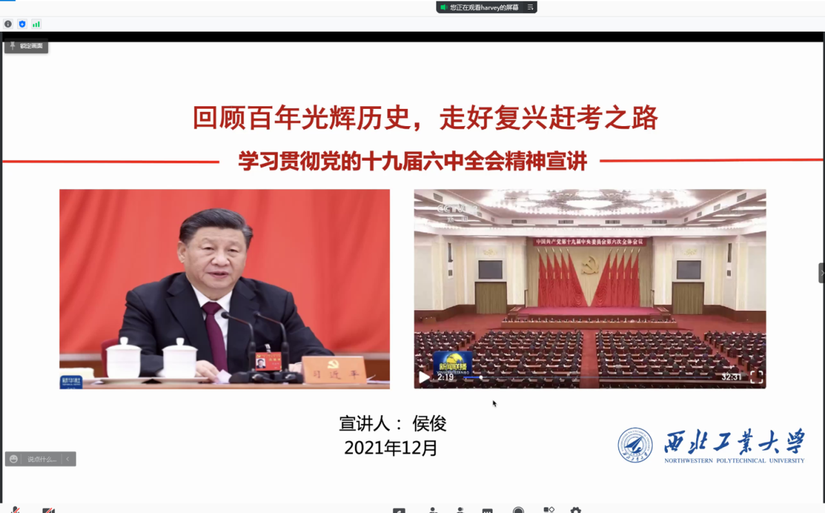 12月28日下午,WilliamHill体育信息工程系党支部在线开展了“贯彻落实党的十九届六中全会精神,做好疫情防控工作”专题学习活动,公司党委书记侯俊同志为支部全体党员讲授了“回顾百年光辉历史,走好复兴赶考之路”的专题党课,宣讲党的十九届六中全会精神。会议由支部书记戴玉超同志主持。侯俊从一个初心使命,两个确立,三个“需要”,三个《决议》等方面,深入阐释了《中共中央关于党的百年奋斗重大成就和历史经验的决议》的主要精神,回顾了中国共产党的百年奋斗和伟大成就,学习了中国共产党的百年奋斗历史经验和精神财富,总结了中国共产党的百年奋斗历史意义和复兴新程。号召支部党员以史为鉴、开创未来,埋头苦干、勇毅前行,立足自身岗位为实现第二个百年奋斗目标、实现中华民族伟大复兴的中国梦而不懈奋斗。