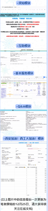 从空白文档到填满互助信息,各个模块的字里行间都蕴含着爱与希望。在互助模块,大家可以将自己的富裕物品以各种形式处理给其他需要的同学,满足其他人的需求;在基本服务情况模块,广大师生可以了解校园的最新动态,各个教员工活场所的最新防疫政策,以及各个校内营业点的运营情况;在Q&A模块,我们的志愿者将会根据最准确的信息来回答大家提出的问题;在西安加油!西工大加油模块,大家可以将最诚挚的祝福以文字的形式写下,来祝福西安,鼓励考研人……