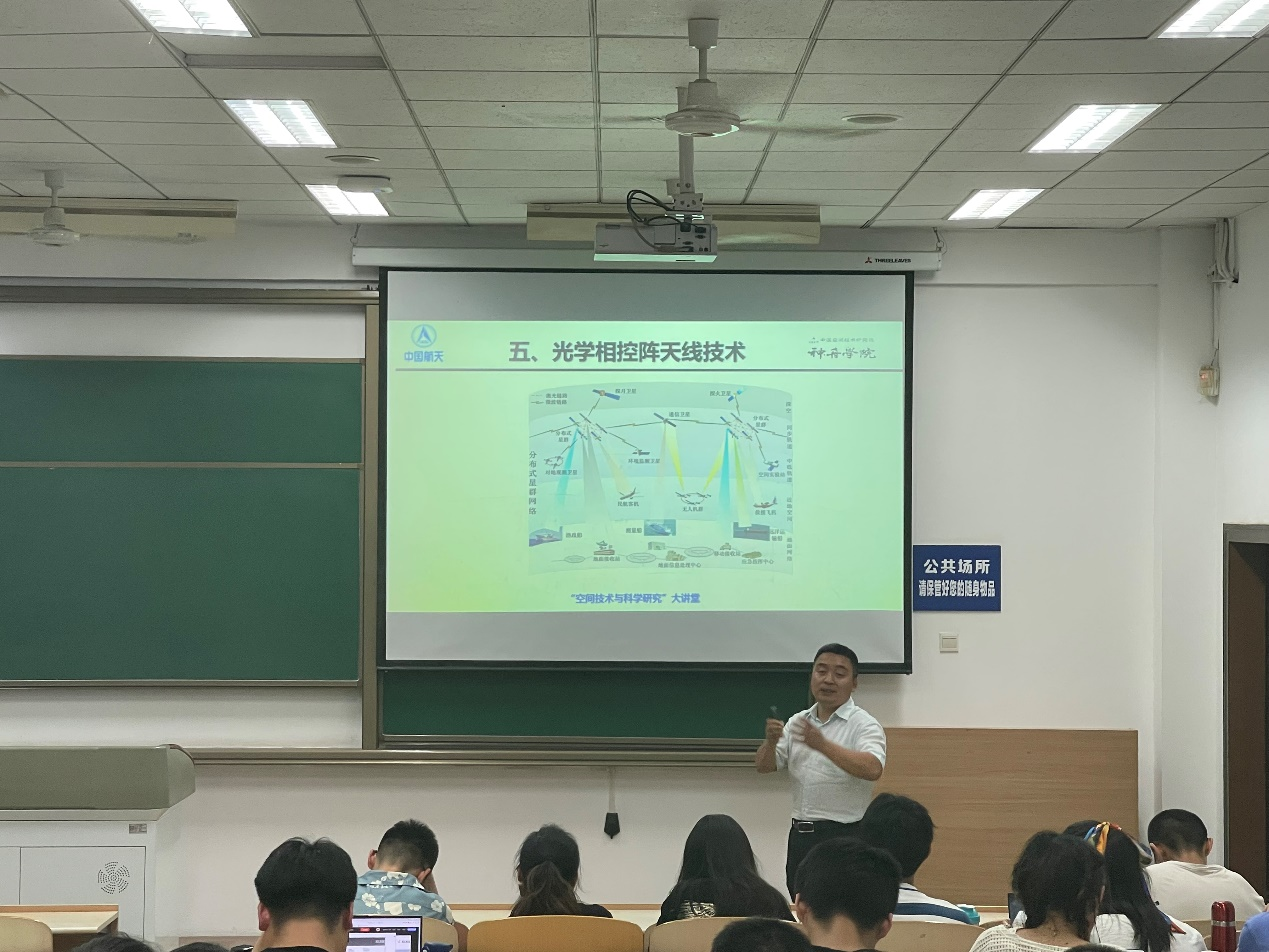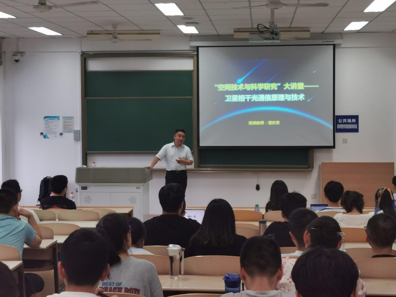 谭庆贵结合自身科研工作经历,从卫星光通信技术发展动态、卫星相干光通信的基本原理、卫星光通信的关键技术、卫星相干光通信的发展前景与发展趋势、光学相控阵天线技术和微波光子技术等方面,用深入浅出的语言、生动详实的案例对卫星相干光通信进行了全面讲解。在随后的互动环节中,谭博士鼓励同学们瞄准国防“主战场”,立足当下、孜孜不倦,在自己的专业方向上努力学习、持续进步,努力成为国之栋梁。