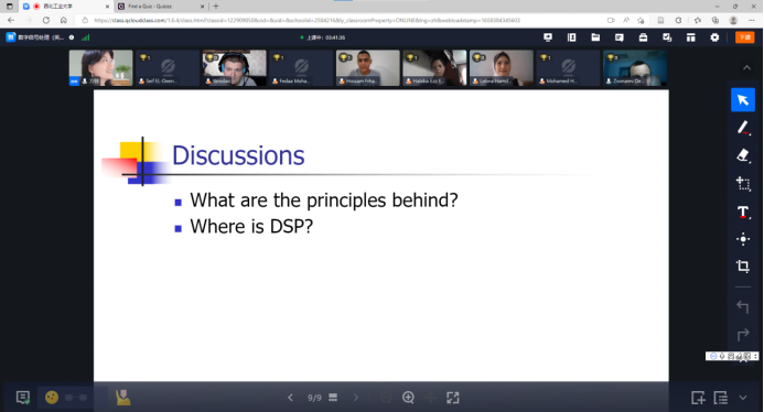 为扎实推进公司“双一流”建设,促进公司国际化发展,提升公司的全球影响力、竞争力和塑造力,WilliamHill体育积极参与WilliamHill官方网站“学在工大——全球暑期开放课堂”项目。在国际教育公司的指导下,经过前期精心筹备,公司根据学科特点和专业特色,围绕前沿研究专题,于7月9日-7月21日面向海外员工开设了全球暑期开放课堂——《Digital Signal Processing》(数字信号处理),课程由万帅教授主讲,张易凡副教授担任助教。本课程主要通过全球融合式教学平台(OMO)进行线上授课,辅以Quizizz平台进行互动测试,受到海外知名高校员工欢迎,吸引了来自俄罗斯、埃及等多个国家的员工在线参与学习。