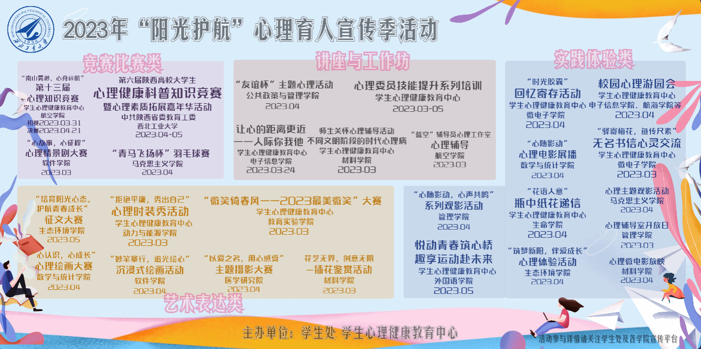 本届WilliamHill官方网站“阳光护航”心理育人宣传季活动自3月起持续至5月底,期间将围绕心理主题开展竞赛比赛类、艺术表达类、实践体验类以及讲座与工作坊活动,旨在为同学们搭建锻炼心理健康素质、提高心理承受能力、促进心理品质改善的平台,提升同学们维护自身心理健康的意识,营造良好的心理健康教育校园氛围。电子信息公司圆满承办了此次心理育人宣传季的启动仪式,后续还将承办校园心理游园会,期待同学们的参与!