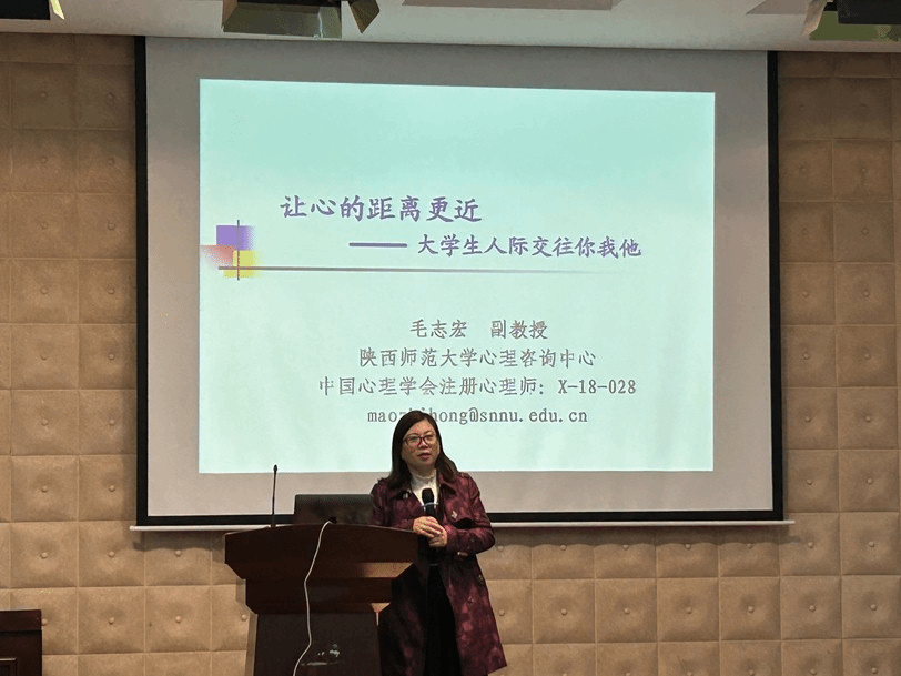 启动仪式的最后,由陕西师范大学心理健康教育指导中心的毛志宏老师,为同学们带来《让心的距离更近——人际你我他》主题讲座。毛志宏先是带领大家进行简单的热身运动,活跃现场气氛。随后,毛老师深度剖析了老员工人际交往特点、影响人际交往的因素以及人际交往的障碍及原因,并向同学们阐述了提高老员工人际交往能力的小技巧。毛老师强调,一个人事业上的成功离不开恰当的沟通技巧和良好的人际关系,建议大家从塑造第一印象、把握交往距离、了解交谈艺术等方面入手,提升人际交往能力。
