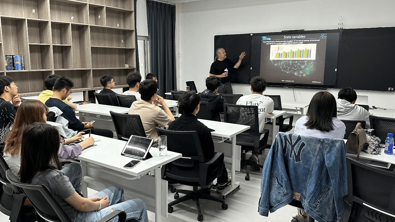接着,Michael Scholz研究员从经颅电刺激(tECS)的基本概念出发,详细介绍了其团队结合患者特定的脑状态和实时反馈设计的闭环刺激方案,以此为基础着重介绍了一种短时刺激和测量方案,发现即使极短的刺激也能产生可测效果。Michael Scholz 研究员的报告,案例详实、理论丰富、内容前沿,与会师生受益良多。报告结束后,Michael Scholz 研究员与公司师生进行了充分的互动交流,详细解答了师生相关疑问。