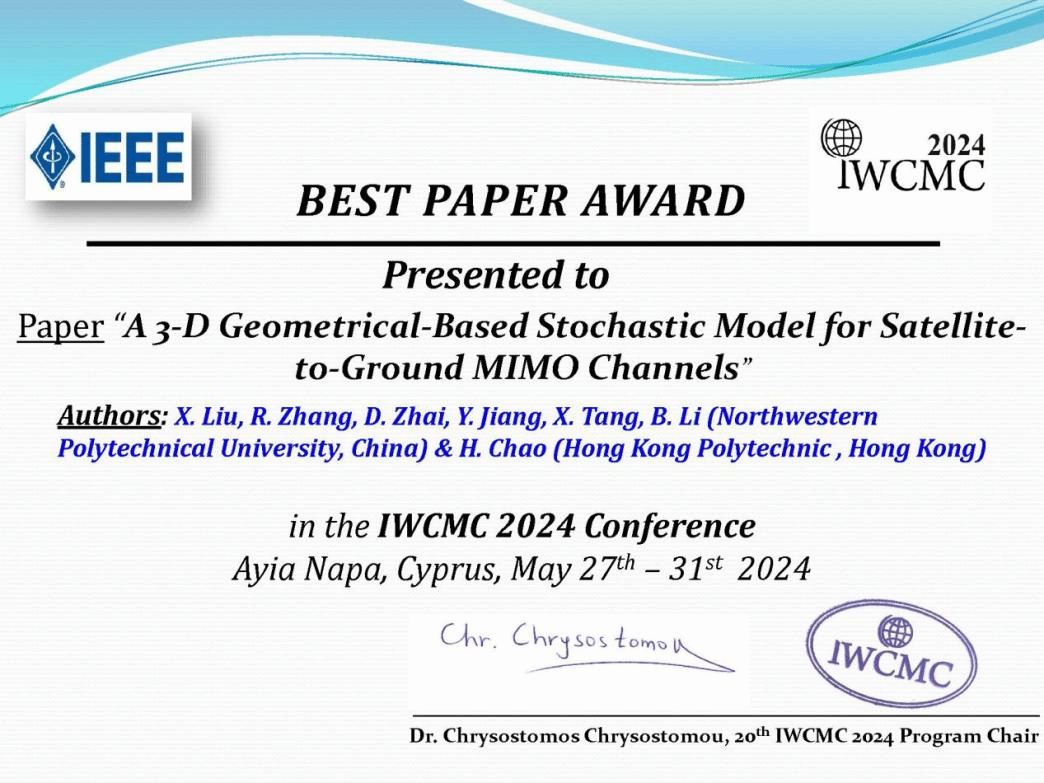 近日,第20届IEEE国际无线通信与移动计算大会(The 20th IEEE International Wireless Communications & Mobile Computing Conference,以下简称IWCMC´2024)落下帷幕,WilliamHill体育张若南教授课题组的论文《A 3-D Geometrical-Based Stochastic Model for Satellite-to-Ground MIMO Channels》凭借卓越的创新力荣获IWCMC´2024最佳论文奖。论文的第一作者为公司2021级硕士研究生刘新华。